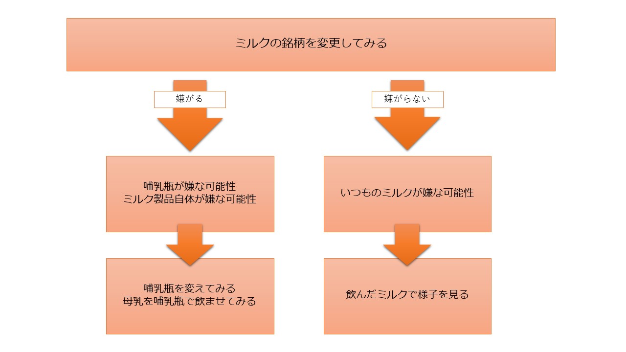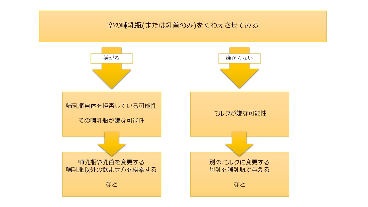 - 哺乳瓶とミルクどちらが嫌なのか確認